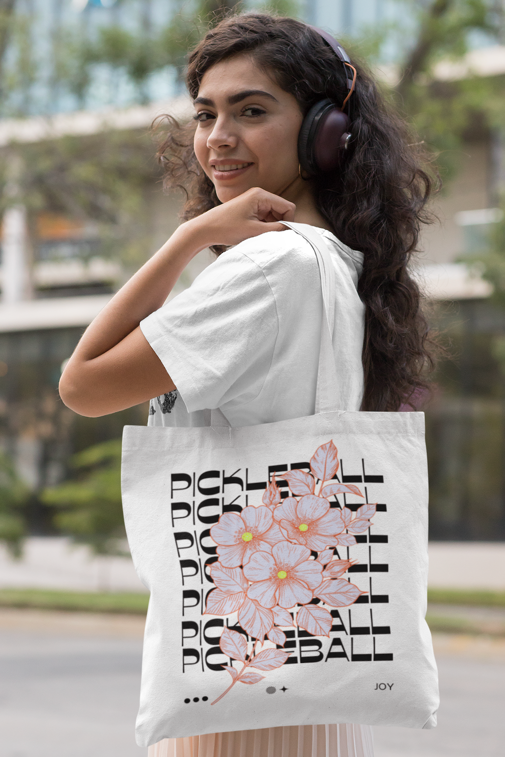 Woman wearing headphones and holding a tote bag with a floral design and text.